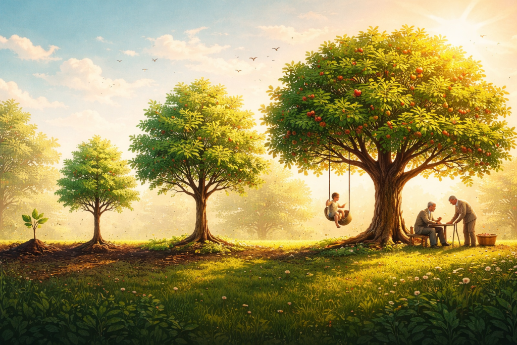 بعدها تثمر الشجرة، وتنشر بذورها، ويستظل تحتها عابر السبيل، وتبني الطيور أعشاشها بين أغصانها، وهذي المرحلة حتى عمر الستين.